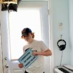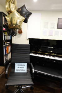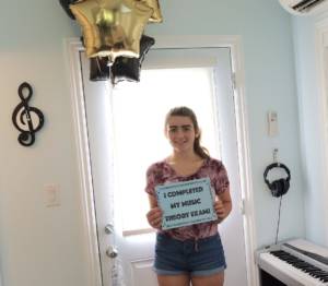 Jasmine holding a “I Completed My Music Theory Exam” Poster and balloons. Photo taken after the exam was complete.